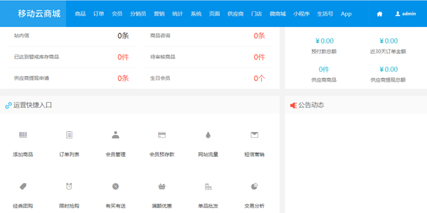 6、后臺支持系(xi)統(tong)包含商品管(guan)理(li)、訂單(dan)管(guan)理(li)、會員管(guan)理(li)、分(fen)銷(xiao)員管(guan)理(li)、營銷(xiao)中心、統(tong)計分(fen)析、基本設(she)置(zhi)(zhi)、頁面管(guan)理(li)、供應商管(guan)理(li)、門店(dian)管(guan)理(li)、微商城管(guan)理(li)、小程序管(guan)理(li)、生活號(hao)設(she)置(zhi)(zhi)等模塊。