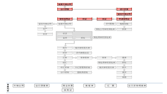 業(ye)務流(liu)(liu)程:CIF+L/C,CIF+/D/A,CIF+D/P,CIF+T/T Before shipment CIF+T/T After shipment FOB+L/C,FOB+/D/A,FOB+D/P,FOB+T/T Before shipment FOB+T/T After shipment CFR+L/C,CFR+/D/A,CFR+D/P,CFR+T/T Before shipment CFR+T/T After shipment 業(ye)務流(liu)(liu)程:在這(zhe)里(li)填(tian)寫(xie)和(he)查看(kan)所(suo)需要的(de)單(dan)據(ju)(ju)。直(zhi)接可在流(liu)(liu)程圖(tu)中表現(xian)。查看(kan)的(de)單(dan)據(ju)(ju)分填(tian)寫(xie)的(de)單(dan)據(ju)(ju)和(he)收(shou)到的(de)單(dan)據(ju)(ju)