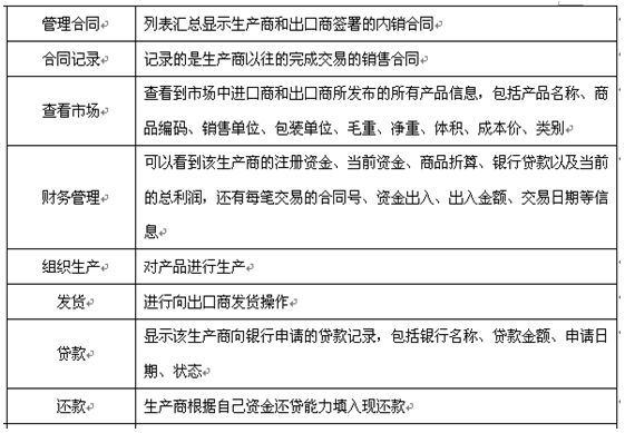 7、可(ke)以配置(zhi)進口(kou)(kou)(kou)商(shang)(shang)(shang)、出口(kou)(kou)(kou)商(shang)(shang)(shang)、進口(kou)(kou)(kou)地(di)銀(yin)(yin)(yin)行、出口(kou)(kou)(kou)地(di)銀(yin)(yin)(yin)行、國(guo)稅(shui)局、海(hai)關(guan)、商(shang)(shang)(shang)檢(jian)局、保險(xian)公(gong)司、貨(huo)代(dai)公(gong)司、外匯(hui)管理局等相關(guan)參數和業務,在實訓過程(cheng)中可(ke)以分組、分角色(se)進行互動(dong)、交互式訓練(lian)。角色(se)扮演(yan):出口(kou)(kou)(kou)商(shang)(shang)(shang)、進口(kou)(kou)(kou)商(shang)(shang)(shang)、生產商(shang)(shang)(shang)(工(gong)廠)、進口(kou)(kou)(kou)銀(yin)(yin)(yin)行、出口(kou)(kou)(kou)銀(yin)(yin)(yin)行、保險(xian)公(gong)司、商(shang)(shang)(shang)檢(jian)局、海(hai)關(guan)、外匯(hui)管理局、貨(huo)代(dai)、國(guo)稅(shui)局