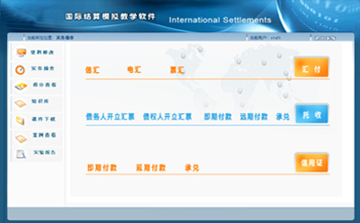 《思沃國(guo)(guo)際結算(suan)模(mo)擬實訓系(xi)統》從高(gao)校(xiao)國(guo)(guo)際結算(suan)教學的(de)實際需求出發,主(zhu)要從匯(hui)付(fu)、托收(shou)、信(xin)用證(zheng)三種(zhong)不同類型的(de)結算(suan)方式,本教學平臺軟件(jian)逼真地模(mo)擬了出口商、進口商、匯(hui)入(ru)行(xing)(xing)、匯(hui)出行(xing)(xing)等(deng)角色的(de)辦事流程。