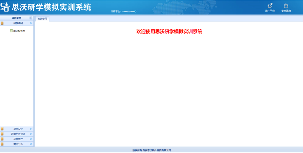 思沃研(yan)(yan)學(xue)(xue)(xue)(xue)(xue)模(mo)擬實(shi)訓(xun)系統(tong)分為(wei)管理員,教師(shi),學(xue)(xue)(xue)(xue)(xue)生(sheng)三(san)種(zhong)角色,功(gong)能包括推廣(guang)(guang)平(ping)臺、首(shou)頁,知識庫,研(yan)(yan)學(xue)(xue)(xue)(xue)(xue)推廣(guang)(guang),圖文結合廣(guang)(guang)告,媒體推送廣(guang)(guang)告,研(yan)(yan)學(xue)(xue)(xue)(xue)(xue)調(diao)研(yan)(yan),研(yan)(yan)學(xue)(xue)(xue)(xue)(xue)設(she)(she)計等(deng)。學(xue)(xue)(xue)(xue)(xue)生(sheng)通過模(mo)擬實(shi)訓(xun)體驗(yan)從研(yan)(yan)學(xue)(xue)(xue)(xue)(xue)內容(rong)調(diao)研(yan)(yan)、研(yan)(yan)學(xue)(xue)(xue)(xue)(xue)路線設(she)(she)計、研(yan)(yan)學(xue)(xue)(xue)(xue)(xue)核心價值發(fa)掘(jue)、研(yan)(yan)學(xue)(xue)(xue)(xue)(xue)媒體網絡推廣(guang)(guang)等(deng)一系列工作內容(rong)。 研(yan)(yan)學(xue)(xue)(xue)(xue)(xue)軟件包含案(an)例分析,點評(ping),研(yan)(yan)學(xue)(xue)(xue)(xue)(xue)線路設(she)(she)計,團(tuan)隊類(lei)(lei)(lei)型(xing),機型(xing),小交通標準(zhun)(zhun),出入(ru)境口岸,匯率維(wei)護,酒店(dian)類(lei)(lei)(lei)型(xing),研(yan)(yan)學(xue)(xue)(xue)(xue)(xue)類(lei)(lei)(lei)型(xing)知識庫類(lei)(lei)(lei)型(xing),案(an)例類(lei)(lei)(lei)型(xing),航空公司(si),線路區域,團(tuan)隊等(deng)級(ji),住宿標準(zhun)(zhun),大交通標準(zhun)(zhun),門票標準(zhun)(zhun),餐飲(yin)標準(zhun)(zhun),導游證類(lei)(lei)(lei)別,酒店(dian)等(deng)級(ji),客戶行(xing)(xing)業分類(lei)(lei)(lei),客戶等(deng)級(ji)分類(lei)(lei)(lei),客戶關系深度,地(di)接(jie)車等(deng)級(ji),客戶接(jie)受(shou)程度,國(guo)家維(wei)護,省(sheng)份維(wei)護,城市(shi)維(wei)護,景點類(lei)(lei)(lei)型(xing),學(xue)(xue)(xue)(xue)(xue)生(sheng)可以進行(xing)(xing)系統(tong)的模(mo)擬學(xue)(xue)(xue)(xue)(xue)習。