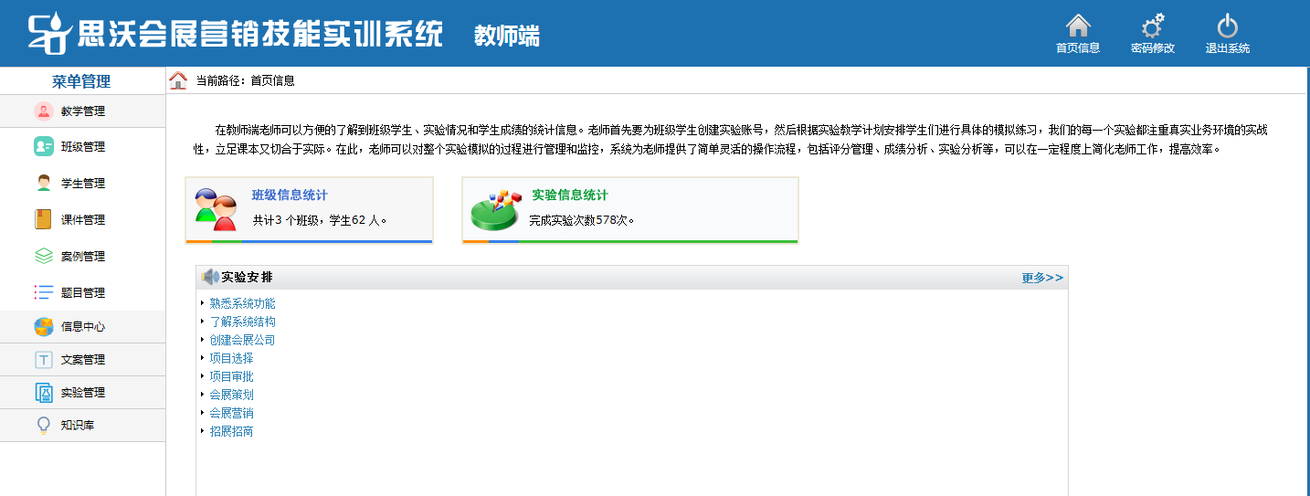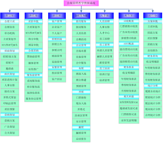 思沃會展(zhan)(zhan)營銷模擬(ni)(ni)實(shi)訓(xun)系統以(yi)(yi)(yi)模擬(ni)(ni)會展(zhan)(zhan)公司的(de)(de)(de)(de)(de)策(ce)劃部(bu)、外聯部(bu)、招(zhao)商(shang)部(bu)、會展(zhan)(zhan)服務(wu)部(bu)、人(ren)(ren)事(shi)部(bu)、財務(wu)部(bu)以(yi)(yi)(yi)及(ji)總經辦(ban)7大(da)業(ye)(ye)務(wu)部(bu)門為(wei)基礎而展(zhan)(zhan)開實(shi)驗操作的(de)(de)(de)(de)(de)。該教學(xue)(xue)平臺軟件業(ye)(ye)務(wu)內容包括了(le)(le):項目(mu)上報審批(pi)、項目(mu)的(de)(de)(de)(de)(de)策(ce)劃安排、服務(wu)商(shang)管理(li)、人(ren)(ren)事(shi)招(zhao)聘與管理(li)、會展(zhan)(zhan)的(de)(de)(de)(de)(de)現場(chang)服務(wu)與合同(tong)管理(li)等(deng)等(deng),讓學(xue)(xue)生通過實(shi)驗感受會展(zhan)(zhan)項目(mu)的(de)(de)(de)(de)(de)系統化管理(li)流程與業(ye)(ye)務(wu)操作內容,不但能夠了(le)(le)解(jie)會展(zhan)(zhan)項目(mu)從立項審批(pi)到(dao)策(ce)劃、宣傳、招(zhao)展(zhan)(zhan)招(zhao)商(shang)、現場(chang)服務(wu)以(yi)(yi)(yi)及(ji)會后總結各個環節的(de)(de)(de)(de)(de)業(ye)(ye)務(wu),同(tong)時還可(ke)以(yi)(yi)(yi)掌(zhang)握各種(zhong)(zhong)文案的(de)(de)(de)(de)(de)寫作技(ji)巧,從而讓學(xue)(xue)生真(zhen)正的(de)(de)(de)(de)(de)理(li)解(jie)并(bing)掌(zhang)握會展(zhan)(zhan)這一行(xing)業(ye)(ye)的(de)(de)(de)(de)(de)各種(zhong)(zhong)知識與業(ye)(ye)務(wu)要(yao)求。為(wei)學(xue)(xue)生以(yi)(yi)(yi)后的(de)(de)(de)(de)(de)工作、學(xue)(xue)習提(ti)供了(le)(le)一個實(shi)戰演練的(de)(de)(de)(de)(de)實(shi)訓(xun)平臺,增強了(le)(le)學(xue)(xue)生進(jin)入工作崗位后的(de)(de)(de)(de)(de)實(shi)力。